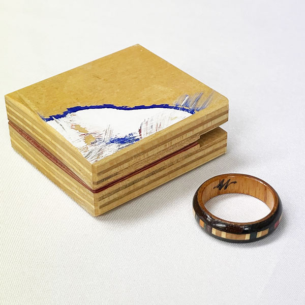 リングケースもデッキ廃材で作られており、ケースに刻まれた傷は役目を終えたデッキの証。
