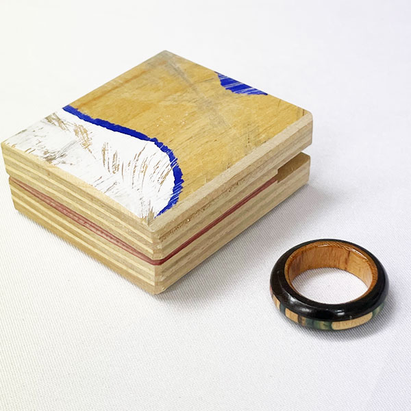 リングケースもデッキ廃材で作られており、ケースに刻まれた傷は役目を終えたデッキの証。
