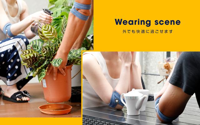 素材: ・バンド (ポリエステル90%、ポリウレタン10%、パッチ部分:ポリエステル100%)、パッチ部分:ポリエステル100%) ・指圧ボタン(プラスチック)