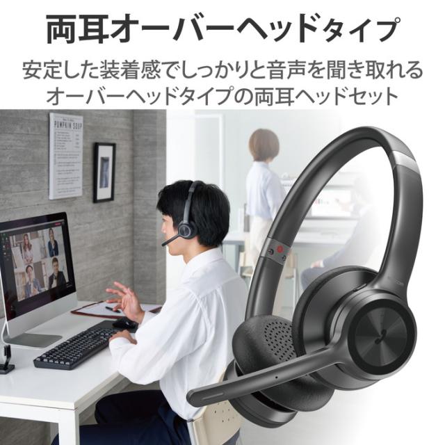 ■デュアルマイクノイズリダクション機能でクリアな音声を届ける、オーバーヘッドタイプの両耳Bluetooth(R)ヘッドセットです。 ■オンライン会議などの際に自席から離れたり、通話中に別の作業をしたりしながらでも通話可能な、ケーブルのないワイヤレスタイプです。 ■安定した装着感で長時間の使用でも疲れにくく、しっかりと音声を聞き取れるオーバーヘッドタイプの両耳ヘッドセットです。 ■周囲の雑音(環境音)を拾うマイクと、自身の声(通話音)を拾うマイクの両方を搭載することでノイズを除去するデュアルマイクノイズリダクション機能付きで、ノイズを除去したクリアな音声を相手に伝えます。 ■肌触りの良いやわらかなクッション性のある耳当てを採用し、耳へのストレスを軽減します。 ■ヘッドバンドはアジャスター付きで、頭に合わせて使いやすい長さに調節できます。 ■着信応答/終話やボリューム調整ができるボタン付きで、接続機器を触ることなく、ヘッドセット側で操作可能です。 ■※すべての機器やアプリで動作を保証するものではありません。 ■マイクミュートボタン付きで、ボタン操作で、通話中にこちらの音を相手に聞こえないように切り替え可能です。 ■バッテリーが無くても、付属のUSBケーブルで有線接続可能です。 ■VoLTEの通話品質を最大限に活かせるHD Voiceに対応し、相手の声もクリアに聞き取り可能です。 ■スマートフォンやパソコンなど、通信機器2台を同時に待ち受けできるマルチポイントに対応しています。 ■最大連続待受約200時間、連続通話約33時間、連続音楽再生約35時間の長時間駆動を実現します。 ■スマートフォン画面へのヘッドセットのバッテリー残量表示が可能です。 ■取扱説明書記載のQRから、はじめてBluetooth(R)ヘッドセットをお使いの方でも簡単に安心して設定ができる簡単接続ガイドを確認可能です。 ■※運転中の使用や車内へのヘッドセットの放置はおやめください。事故や発火の原因となります。 ■自社環境認定基準を1つ以上満たし、『THINK ECOLOGY』マークを表示した製品です。 ■廃棄物削減に取り組み、製品に同梱する取扱説明書等をペーパーレス化した製品です。