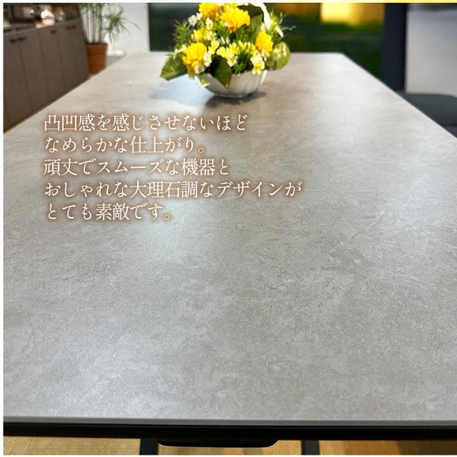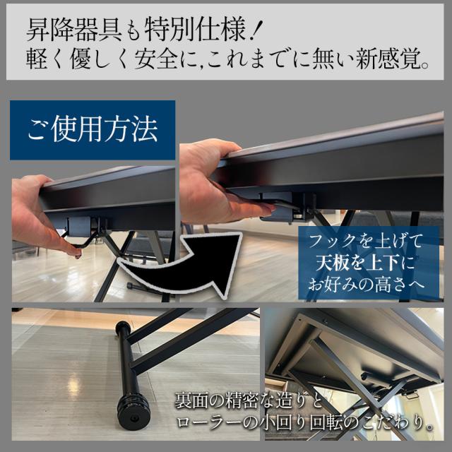 | 家具、チェスト | 高級感溢れるこだわりある昇降式テーブルです。 大理石調のセラミック天板は今人気のダイニング仕様。 熱やキズに強い素材として見た目のおしゃれさと実用性を兼ね備えた逸品です。 高さは無段階調整にて、フックを上げて、天板を上下する仕様として、 楽にスムーズに可動します。音も静かで上品かつ美しい仕上がりとなっています。 昇降テーブルとして天板も金具もローラーも、デザインが際立つセンス溢れるリビングテーブルとなっています。 |