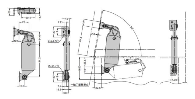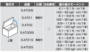 ●スプリングの反力により、上蓋を軽く持ち上げられます。 ●扉を簡易的に保持します(約10°〜80°)。 ●小型のため、中のスペースを有効に活用できます。 ●側板付用と背板付用からお選びいただけます。どちらも左右兼用です。 ●上蓋の質量・サイズにより、反力強タイプと反力弱タイプからお選びいただけます。 ●蓋の最大モーメントが約2倍のS-AT02Wもあります。 【仕様】 ●使用温度:0℃〜40℃ ●使用湿度:90%RH以下 【注意】 ●上蓋に対し、開き角度以上にあおりを加えないように別途ストッパーなどを設けてください。 ●取付面の材質もご考慮ください。剛性が低いと変形または破損することがあります。 ●連続開閉の目的には設計されておりません。 ●屋外で使用しないでください。 ●経年変化により、反力が若干変化します。また、上蓋の質量や、重心位置などによっては保持できない場合があります。 ●スライド丁番(多軸丁番)のご使用はおやめください。 ●パワーアシストで楽々操作 スプリングの反力により、上蓋を軽く持ち上げられます。 上蓋の質量・サイズにより、反力強タイプと反力弱タイプからお選びいただけます。 ●簡易保持機能 上蓋は、開き角度約10°〜80°の範囲で簡易的に保持できます。 ●小型で省スペース ステー本体は小型なため、筐体内のスペースを有効に活用できます。 【機種選定グラフ】 機種選定グラフ、蓋のモーメント計算式は、上蓋の重心位置が高さ寸法の中央にあり、右ページの図面寸法に従って取り付けを行った場合の値です。 【ステーの選定】 ●蓋の最大モーメントに応じて2種類の中から選べます。 蓋の最大モーメント(N・m)=蓋質量(kg)×9.80665×回転軸中心から重心位置までの距離(m) 蓋の最大モーメントN・m:品番:必要数 4.1〜6.1:S-AT005(S):1本 6.1〜8.8:S-AT01(S):1本 8.8〜11.8:S-AT02(S):1本 ●2本使いの場合は、上記モーメントの2倍まで対応できます。 【材料】 ステンレス鋼(SUS430)/ポリアセタール(POM) 【仕上】 素地 【扉の最大モーメントN・m/1本】蓋の最大モーメントN・m/1本:8.8〜 11.8 【扉の最大モーメントkgf/1本】蓋の最大モーメントkgf・cm/1本:90〜 120 【注文コード】180-017-547 【品番】S-AT02S 製品内容は、部品としての品質範囲です。この部品を使用した最終製品の機能・性能・安全を保証するものではありません。 ※画像はイメージです。 ※パッケージ、仕様、品番などの変更が予告なく変更される場合が御座います。 カテゴリー |