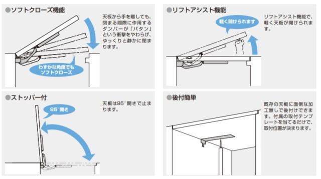 ●カウンター出入口の天板に最適なダンパーです。 ●ラプコン機構を搭載しているため、天板から手を離しても、閉まる間際にダンパーが作用し、ゆっくりと静かに閉まります。わずかな開き角度でもダンパーが作用します。 ●リフトアシスト機能により、軽く天板が開けられます。 ●ストッパーにより、天板は95°開きで止まります。 ●15〜40mmの幅広い板厚に対応します。 ●既存の天板に加工不要で後付けできます。 ●付属のテンプレートで取付位置が簡単に決められます。 【仕様】 ●使用温度:0℃〜40℃ 【注意】 ●2セット以上では使用できません。 ●開いた状態は、天板が固定されているわけではありません。 ●天板の吊元に一軸丁番、または隠し丁番R-70、R-100(いずれも別売品)を併用してご使用ください。 ●スライド丁番との併用はできません。 ●本品のみでは閉めた天板の保持はできません。閉めた天板の先端側に受け部を設置してください。 ●天板を必要以上に強く開閉しないでください。 ●ダンパーユニットおよびストッパーの取付面から天板表面までの距離が15〜40mmになるようにしてください(図面参照)。 ●アームユニットとダンパーユニットの間に指などを挟まないよう注意・警告してください。 ●厚板対応スペーサーLAD-DP型、水平取付用ブラケットLAD-BKTとの併用はできません。 【付属品】 ●十字穴付バインドタッピンねじ4×16 ●位置決め用テンプレート 【別売品】 ●LAD用取付補助プレートLAD-SPT ●ソフトクローズ機能 天板から手を離しても、閉まる間際に作用するダンパーが「バタン」という衝撃をやわらげ、ゆっくりと静かに閉まります。 ●リフトアシスト機能 リフトアシスト機能で、軽く天板が開けられます。 ●ストッパー付 天板は95°開きで止まります。 ●後付簡単 既存の天板に面倒な加工無しで後付けできます。付属の取付テンプレートを当てるだけで、取付位置が決まります。 ※ストッパーの取付位置は使用する丁番や天板の厚みによって異なります。付属の位置決め用テンプレートをご使用ください。 【機種選定グラフ】 機種の選定は左の表を目安にしてください。 この表に無いサイズの天板を使う場合は、下記の式により、天板のモーメントの計算を行ってください。 天板の質量は、天板に取り付く装飾なども含めてください。 天板の最大モーメント(N・m) =天板質量(kg)×9.80665×回転軸中心から重心位置までの距離(m) アームユニット取付面を補強するプレート(別売品)もあります。 LAD用取付補助プレートLAD-SPT 【材料】 ABS樹脂/ポリアセタール(POM)/鋼/亜鉛合金 【仕上】 亜鉛めっき/ニッケルクロムめっき/ニッケルめっき 【扉の最大モーメントN・m/1本】天板の最大モーメントN・m/1本:10.5〜 13.5 【扉の最大モーメントkgf/1本】天板の最大モーメントkgf・cm/1本:107.1〜 137.7 【重量】750g 【注文コード】170-033-214 【品番】LAD-ST-M 適応板厚:15〜 39 製品内容は、部品としての品質範囲です。この部品を使用した最終製品の機能・性能・安全を保証するものではありません。 ※画像はイメージです。 ※パッケージ、仕様、品番などの変更が予告なく変更される場合が御座います。 カテゴリー |