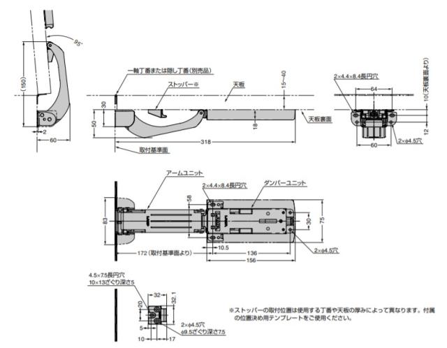 ダンパーユニットおよびストッパーの取付面から天板表面までの距離が15〜40mmになるようにしてください(図面参照)。