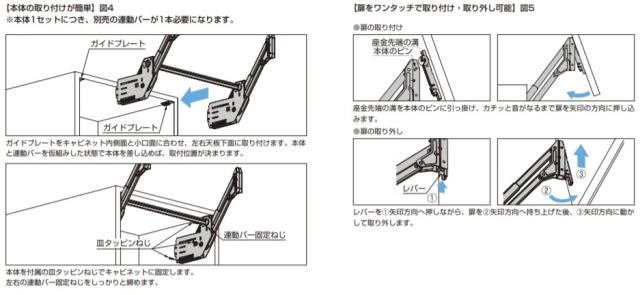 ※扉質量にはハンドルを含めてください。 ●オリジナルメカニズム《ラプコン》の働きにより、扉の開閉動作をソフト&スムーズにコントロールします。 ・わずかな力で扉を開けられます(図1参照)。 ・任意の位置で扉を止められます(図2参照)。 ・扉が閉まる際は、手を離してもゆっくりと閉まり安全です(図3参照)。 ●どの位置にハンドルを取り付けても、スムーズに扉を開閉できます。 ●キャビネット天板下部に取り付けるため、従来のステーよりも高さ方向のデッドスペースが少なく、棚を取り付ける際もステーが邪魔になりません。 ●本体ユニットは簡単に取付位置が決まります(図4参照)。 ●座金はワンタッチで本体ユニットに取り付けできるため、施工が簡単・スピーディーです(図5参照)。 【仕様】 ●使用温度:0℃〜40℃ 【注意】 ●本体1セットにつき、別売の連動バーが1本必要になります。 ●本製品は必ず左右セットでご使用ください。 ●使用温度範囲外でのご使用はおやめください。発熱する電子レンジなどを収納するキャビネットには絶対に使用しないでください。 【付属品】 ●取付座金(2ヶ) ●ガイドプレート(2ヶ) ●十字穴付皿タッピンねじ3.5×38(6本)本体取付用 ●十字穴付バインドタッピンねじ3.5×15(6本)座金取付用 【別売品】 ●連動バーELB型 本体がコンパクトでデッドスペースが少なく、棚の取り付けでもステーが邪魔になりません。 【扉の動き】 ●リフトアシスト機能 わずかな力で扉を開けられます。 ●フリーストップ機能 任意の位置で扉を止められます。 ※作動範囲は扉サイズ・質量により、若干異なります。 ●ソフトクローズ機能 扉が閉まる際は、手を離してもゆっくりと閉まり安全です。 ※作動範囲は扉サイズ・質量により、若干異なります。 【本体の取り付けが簡単】図4 ※本体1セットにつき、別売の連動バーが1本必要になります。 ガイドプレートをキャビネット内側面と小口面に合わせ、左右天板下面に取り付けます。本体と連動バーを仮組みした状態で本体を差し込めば、取付位置が決まります。 本体を付属の皿タッピンねじでキャビネットに固定します。 左右の連動バー固定ねじをしっかりと締めます。 【扉をワンタッチで取り付け・取り外し可能】図5 ●扉の取り付け 座金先端の溝を本体のピンに引っ掛け、カチッと音がなるまで扉を矢印の方向に押し込みます。 ●扉の取り外し レバーを(1)矢印方向へ押しながら、扉を(2)矢印方向へ持ち上げた後、(3)矢印方向に動かして取り外します。 【材料】 アルミニウム合金 【仕上】 アルマイト処理 【サイズ】 キャビネット幅内寸法※3:1456〜 1466 ※3キャビネット幅内寸法が上表の範囲外の場合は、長い連動バーをカットしてご使用ください(連動バーの長さ=キャビネット幅内寸法-80mm)。 【重量】520g 【注文コード】180-022-322 【品番】ELB-1380 製品内容は、部品としての品質範囲です。この部品を使用した最終製品の機能・性能・安全を保証するものではありません。 ※画像はイメージです。 ※パッケージ、仕様、品番などの変更が予告なく変更される場合が御座います。 カテゴリー |