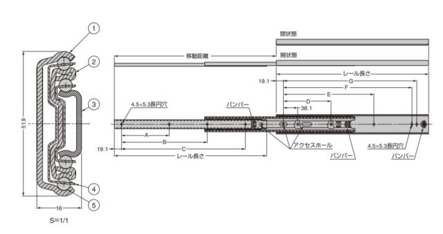●インナーメンバーを完全に引き出せる3段引のスライドレールです。 ●全開時、全閉時の金属音を緩和する消音機構付です。 ●レールを全閉にした時、簡易的にその状態を保持します。 【その他】 ●移動距離の変更による耐荷重の変化は、耐荷重曲線をご覧ください。 【推奨ねじ】 ●M4バインド、またはM4トラスねじ 【材料】 (1)アウターメンバー:鋼 (2)中間メンバー:鋼 (3)インナーメンバー:鋼 (4)リテーナー:鋼 (5)スチールボール:鋼 【仕上】 (1)アウターメンバー:光沢クロメート処理(三価) (2)中間メンバー:光沢クロメート処理(三価) (3)インナーメンバー:光沢クロメート処理(三価) (4)リテーナー:(亜鉛めっき鋼板) (5)スチールボール:- 【サイズ】 レール長さ:移動距離:A:B:C:D:E:F:G 558.8:584.2:177.8:330.2:482.6:177.8:342.9:495.3:508 【耐荷重N】970 /ペア 【耐荷重kgf】98.9 /ペア 【重量】1480g /本 【注文コード】190-014-949 【品番】C3401-22 本品は1本単位での販売です。ご注文数「1」で1本です。 製品内容は、部品としての品質範囲です。この部品を使用した最終製品の機能・性能・安全を保証するものではありません。 ※画像はイメージです。 ※パッケージ、仕様、品番などの変更が予告なく変更される場合が御座います。 カテゴリー |