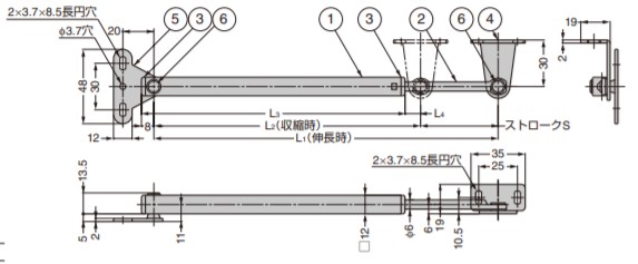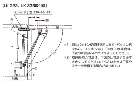●スプリングの作用により、開閉は所定位置で軽快に自動保持します。余分のストローク、余分の操作を必要としません。また開閉時のキャッチも不要です。 ●閉扉時、可動ステー端末部はステー本体内に納まるためキャビネット内部が有効に使えます。 【注意】 ●ステーが伸びきった角度よりもさらに開くことは、絶対にお止めください。 破損の原因となります。開き角度の少し手前で、ストッパーなどで扉の開きを規制してください。本製品は2本でご使用ください。(1本使い不可) 【LK-222、LK-335取付例】 ※1:図はパッキン使用時を示します(パッキン代C=4)。パッキンなし(C=0)の場合は、下表のX寸法に4mmプラスしてください。 ※2:取付例のL’2寸法は、下図のL2寸法より必ず大きくしてください。(小さいときは丁番やステーを破損する場合があります。) 品番:開き角度θ:L?:A:X:Y:扉質量kg LK-222:90°:222:70:20:235:2.5以下 LK-222:85°:222:75:20:240:2.7以下 LK-222:75°:222:85:20:251:3.0以下 LK-335:90°:335:104:20:344:3.1以下 LK-335:85°:335:112:20:351:3.3以下 LK-335:75°:335:127:20:368:3.8以下 LK222:設定扉高さ350mm LK335:設定扉高さ500mm 【LK-335、LK-380取付例】 ※1:図の扉はアクリル製カバー(5mm厚)使用時を示しています。()寸法は参考値です。 ※2:扉寸法・開き角度・バランス位置の設定・重心位置などにより、A、X、Y寸法は適宜変化します。 ※3:閉扉時のL’2寸法は、下図のL2寸法より必ず大きくしてください。(小さいときは丁番やステーを破損する場合があります。) 品番:開き角度θ:扉バランス角α:L?:A:X:Y:扉質量kg LK-335:90°:0.5°:335:295:45:38:2.5 LK-335:90°:14°:335:295:45:38:3.0 LK-335:85°:12°:335:295:45:44:3.3 LK-380:110°:8°:380:330:40:36:2.5 LK-380:90°:3.5°:380:335:55:44:3.0 LK-380:90°:4°:380:320:41:59:4.0 LK-380:80°:7.5:380:335:56:60:4.3 【材料】 (1)本体:ステンレス鋼(SUS304) (2)ステー:ステンレス鋼(SUS304) (3)キャップ:ポリアミド(PA) (4)トップブラケット:ステンレス鋼(SUS304) (5)ボトムブラケット:ステンレス鋼(SUS304) (6)軸:ステンレス鋼(SUS304) —内蔵スプリング:ピアノ線 【色】 (1)本体:- (2)ステー:- (3)キャップ:ブラック (4)トップブラケット:- (5)ボトムブラケット:- (6)軸:- —内蔵スプリング:- 【仕上】 (1)本体:ヘアライン仕上 (2)ステー:研磨 (3)キャップ:- (4)トップブラケット:ヘアライン仕上 (5)ボトムブラケット:ヘアライン仕上 (6)軸:- —内蔵スプリング:有色クロメート処理 【サイズ】 L1:L2:L3:L4:S 222:172:170:10:50 【重量】145g 【注文コード】180-100-045 【品番】LK-222 ステー反力/1本 伸長時N:31 ステー反力/1本 伸長時kgf:3.2 ステー反力/1本 収縮時N:68 ステー反力/1本 収縮時kgf:7.0 製品内容は、部品としての品質範囲です。この部品を使用した最終製品の機能・性能・安全を保証するものではありません。 ※画像はイメージです。 ※パッケージ、仕様、品番などの変更が予告なく変更される場合が御座います。 カテゴリー |