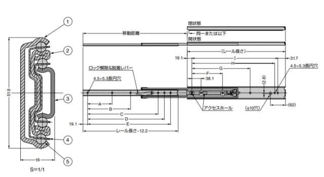●インナーメンバーを完全に引き出せる3段引のスライドレールです。 ●全開にするとレールが固定され、レバー操作で解除でき、同じレバーでインナーメンバーを取り外せます。 ●中間メンバーとアウターメンバーが順序よく開閉するシーケンシャル機構付です。 【注意】 ●動作状況により、ラッチと取付ねじが干渉する場合がありますが、機能上問題ありません。 【推奨ねじ】 ●M4バインド、またはM4トラスねじ 【材料】 (1)アウターメンバー:鋼(SPCC) (2)中間メンバー:鋼(SPCC) (3)インナーメンバー:鋼(SPCC) (4)リテーナー:鋼(SECC) (5)スチールボール:鋼(SWCH) 【仕上】 (1)アウターメンバー:光沢クロメート処理(三価) (2)中間メンバー:光沢クロメート処理(三価) (3)インナーメンバー:光沢クロメート処理(三価) (4)リテーナー:(亜鉛めっき鋼板) (5)スチールボール:- 【サイズ】 レール長さ:移動距離:A:B:C:D:E:F:G:H:I 457.2:483:101.6:203.2:317.5:368.8:394.2:127:292.1:393.7:406.4 【耐荷重N】1000 /ペア 【耐荷重kgf】102 /ペア 【重量】1200g /本 【注文コード】190-021-735 【品番】C3407-18 本品は1本単位での販売です。ご注文数「1」で1本です。 製品内容は、部品としての品質範囲です。この部品を使用した最終製品の機能・性能・安全を保証するものではありません。 ※画像はイメージです。 ※パッケージ、仕様、品番などの変更が予告なく変更される場合が御座います。 カテゴリー |