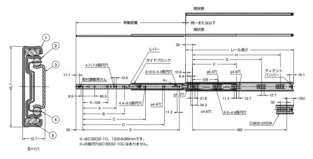 SUGATSUNE スガツネ工業 スライドレール C3832 レール長さ:移動距離:G:H 300:305:242:224:- 190-111-833 C3832-12 | ACCURIDE アキュライド 建築金物 家具金物 部品 金具 金物 部品交換 スライドレール 消音 取付金具 引き出し チェスト デスク 棚 家具 DIY 3段引