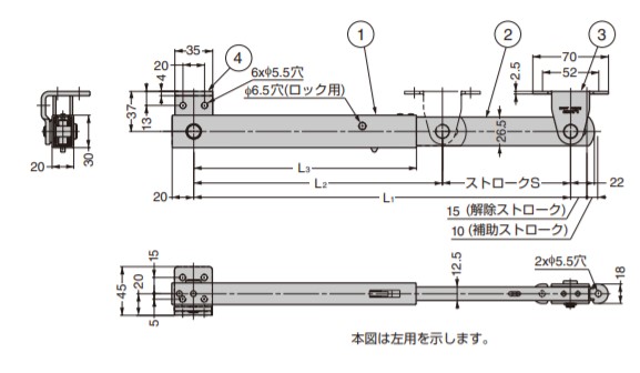 ●ラチェット機構のストッパーにより、扉を開けながら段階的に保持できるステーです。 保持段数:LBTS-350…4段、LBTS-450…6段 ●扉を開時保持位置から解除位置まで持ち上げてストッパーを解除します。保持段数の途中から閉める際は、一度解除位置まで持ち上げてください。 ●閉扉時、可動ステー端末部はステー本体内に納まるためキャビネット内部が有効に使えます。 ●作動の安全性を確保するために、ピンなどをロック穴に通してステーを開時保持位置(最大角度)でロックできます。 【注意】 ●扉高さ・扉開き角度に応じて、ブラケットの位置を適宜に決められますが、この場合、取付例のL’2寸法はLBTS-350が234〜242mm、LBTS450が284〜292mmの範囲内となるようにブラケット位置を決めてください。 (範囲外では丁番やステーを破損したり、伸長時にストッパーが作動しない場合があります。) ●扉を開けたときに、ステーのローターが本体より露出している側を上向きにして取り付けてください。下向きの場合には、ローターがうまく作動しないことがあります。 ●扉1枚に対して1本使いでご使用ください。2本使いで使用すると、左右の作動が同調しない場合があります。 【仕様】 左用 【材料】 (1)外パイプ:ステンレス鋼(SUS304) (2)アーム:ステンレス鋼(SUS304) (3)アームブラケット:ステンレス鋼(SUS304) (4)外パイプブラケット:ステンレス鋼(SUS304) 【仕上】 (1)外パイプ:ヘアライン仕上 (2)アーム:ヘアライン仕上 (3)アームブラケット:光沢バレル研磨 (4)外パイプブラケット:光沢バレル研磨 【サイズ】 L1:L2:L3:S:A:B:C 450:280:256:170:155:442:155.5 【耐荷重N】圧縮荷重N/1本:686 【耐荷重kgf】圧縮荷重kgf/1本:70 【重量】820g 【注文コード】180-109-405 【品番】LBTS-450L 保持段数:6 製品内容は、部品としての品質範囲です。この部品を使用した最終製品の機能・性能・安全を保証するものではありません。 ※画像はイメージです。 ※パッケージ、仕様、品番などの変更が予告なく変更される場合が御座います。 カテゴリー |