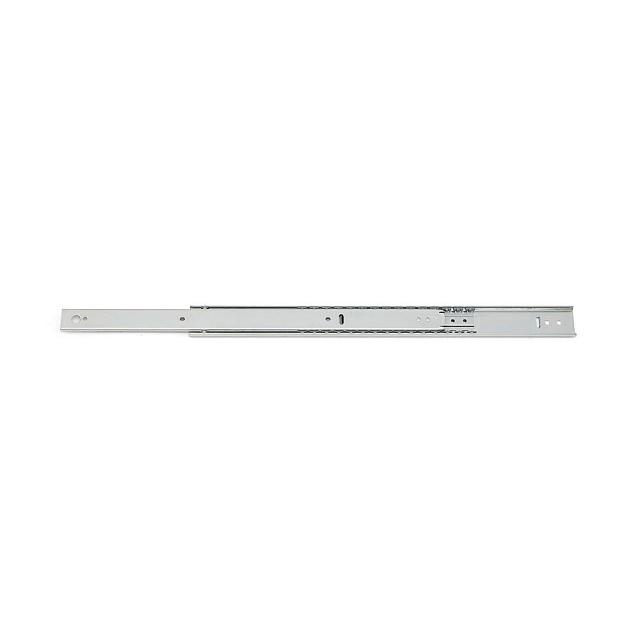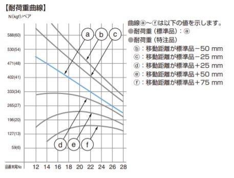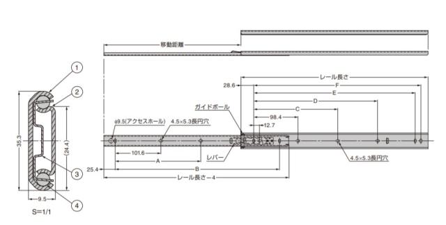 ●3/4スライドの2段引スライドレールです。 ●レールを全開にすると全開状態で固定します。レバー操作で解除でき、同じレバーでインナーメンバーを取り外せます。 【その他】 ●移動距離の変更による耐荷重の変化は、下記の耐荷重曲線をご覧ください。 【注意】 ●取扱い上のご注意を必ずご確認ください。 【推奨ねじ】 ●M4バインド、またはM4トラスねじ 【材料】 (1)アウターメンバー:鋼(SPCC) (2)インナーメンバー:鋼(SPCC) (3)リテーナー:鋼(SECC) (4)スチールボール:鋼(SWCH) 【仕上】 (1)アウターメンバー:光沢クロメート処理(三価) (2)インナーメンバー:光沢クロメート処理(三価) (3)リテーナー:(亜鉛めっき鋼板) (4)スチールボール:- 【サイズ】 レール長さ:移動距離:A:B:C:D:E:F 406.4:315:254:-:-:238.1:349.2:361.9 【耐荷重N】422 /ペア 【耐荷重kgf】43 /ペア 【重量】390g /本 【注文コード】190-111-918 【品番】C203-16LOCK 本品は1本単位での販売です。ご注文数「1」で1本です。 参照ページ ?:P.582 製品内容は、部品としての品質範囲です。この部品を使用した最終製品の機能・性能・安全を保証するものではありません。 ※画像はイメージです。 ※パッケージ、仕様、品番などの変更が予告なく変更される場合が御座います。 カテゴリー |