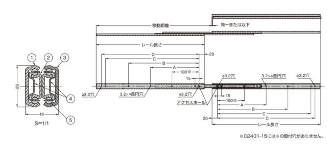 ●インナーメンバーを完全に引き出せる3段引のスライドレールです。 【その他】 ●移動距離の変更による耐荷重の変化は、耐荷重曲線をご覧ください。 【推奨ねじ】 ●M3バインド、またはM3トラスねじ 【材料】 (1)アウターメンバー:鋼(SPCC) (2)中間メンバー:鋼(SPCC) (3)インナーメンバー:鋼(SPCC) (4)リテーナー:鋼(SECC) (5)スチールボール:鋼(SWCH) 【仕上】 (1)アウターメンバー:光沢クロメート処理(三価) (2)中間メンバー:光沢クロメート処理(三価) (3)インナーメンバー:光沢クロメート処理(三価) (4)リテーナー:(亜鉛めっき鋼板) (5)スチールボール:- 【サイズ】 レール長さ:移動距離:A:B:C:D 400:428:-:260:345:360 【耐荷重N】181 /ペア 【耐荷重kgf】18.5 /ペア 【重量】470g /ペア 【注文コード】190-111-903 【品番】C2431-40 本品は1本単位での販売です。ご注文数「1」で1本です。 製品内容は、部品としての品質範囲です。この部品を使用した最終製品の機能・性能・安全を保証するものではありません。 ※画像はイメージです。 ※パッケージ、仕様、品番などの変更が予告なく変更される場合が御座います。 カテゴリー |