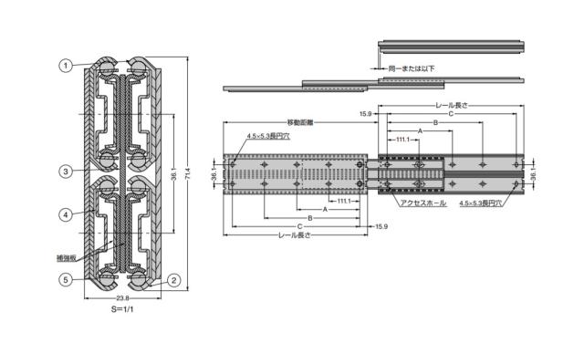 ●インナーメンバーを完全に引き出せる3段引のスライドレールです。 【推奨ねじ】 ●M4バインド、またはM4トラスねじ 【材料】 (1)アウターメンバー:鋼(SPCC) (2)インナーメンバー:鋼(SPCC) (3)中間メンバー:鋼(SPCC) (4)リテーナー:鋼(SECC) (5)スチールボール:鋼(SWCH) 【仕上】 (1)アウターメンバー:光沢クロメート処理(三価) (2)インナーメンバー:光沢クロメート処理(三価) (3)中間メンバー:光沢クロメート処理(三価) (4)リテーナー:(亜鉛めっき鋼板) (5)スチールボール:- 【サイズ】 レール長さ:移動距離:A:B:C 609.6:631.8:288.9:454:577.8 【耐荷重N】2118 /ペア 【耐荷重kgf】216 /ペア 【重量】3730g 【注文コード】190-111-958 【品番】C501-24 本品は1本単位での販売です。ご注文数「1」で1本です。 製品内容は、部品としての品質範囲です。この部品を使用した最終製品の機能・性能・安全を保証するものではありません。 ※画像はイメージです。 ※パッケージ、仕様、品番などの変更が予告なく変更される場合が御座います。 カテゴリー |
