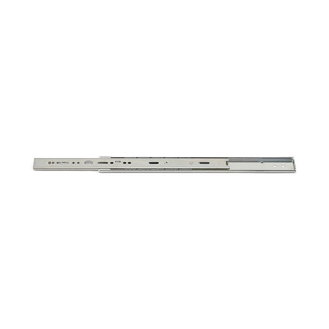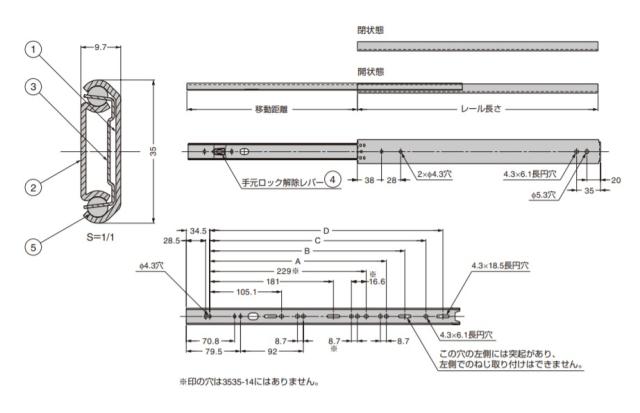 ●3/4スライドの2段引スライドレールです。 ●レール全開時にその状態で固定します。ロック解除レバーの操作で解除します。 ●ロック解除レバーの操作でインナーメンバーを取り外せます。 ●ロック解除レバーはインナーメンバーの先端付近(手元)にあり、ロックの解除がよりしやすく、指を挟みにくく安全です。 ●スチールボールの数が他のレールと比べて多く、動きが滑らかです。 ●インナーメンバーは取付穴が多く、取付位置がいろいろ選べます。 【材料】 (1)アウターメンバー:鋼 (2)インナーメンバー:鋼 (3)リテーナー:鋼 (4)手元ロック解除レバー:鋼 (5)スチールボール:鋼 【仕上】 (1)アウターメンバー:光沢クロメート処理 (2)インナーメンバー:光沢クロメート処理 (3)リテーナー:光沢クロメート処理 (4)手元ロック解除レバー:光沢クロメート処理 (5)スチールボール:- 【サイズ】 レール長さ:移動距離:A:B:C:D 355.6:247:-:273:-:- 【耐荷重N】461 /ペア 【耐荷重kgf】47 /ペア 【重量】350g /1本 【注文コード】190-110-376 【品番】3535-14 本品は1本単位での販売です。ご注文数「1」で1本です。 [ 輸入 ] このマークの製品は輸入品のため「寸法・色調・作動感のばらつき」や、予告なく仕様変更等を行う場合があります。 製品内容は、部品としての品質範囲です。この部品を使用した最終製品の機能・性能・安全を保証するものではありません。 ※画像はイメージです。 ※パッケージ、仕様、品番などの変更が予告なく変更される場合が御座います。 カテゴリー |