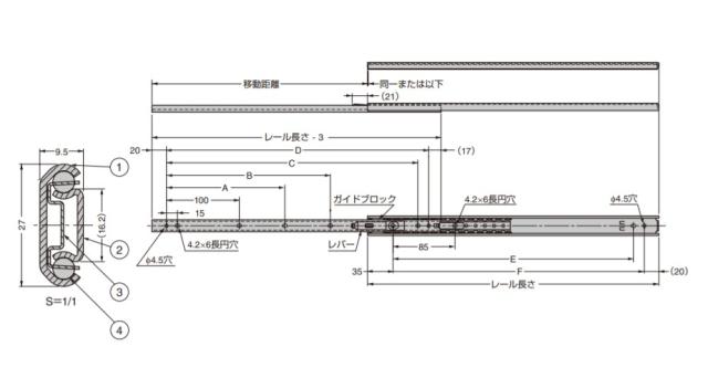 ●3/4スライドの2段引スライドレールです。 ●レール全開時にその状態で固定します。レバー操作で解除します。 ●レバー操作でインナーメンバーを取り外せます。 【推奨ねじ】 ●M4バインド、M3バインド、M3トラスねじのいずれかをご使用ください。 【材料】 (1)アウターメンバー:鋼(SPCC) (2)インナーメンバー:鋼(SPCC) (3)リテーナー:鋼(SECC) (4)スチールボール:鋼(SWCH) 【仕上】 (1)アウターメンバー:光沢クロメート処理(三価) (2)インナーメンバー:光沢クロメート処理(三価) (3)リテーナー:(亜鉛めっき鋼板) (4)スチールボール:- 【サイズ】 レール長さ:移動距離:A:B:C:D:E:F 400:296:225:-:345:360:330:345 【耐荷重N】216 /ペア 【耐荷重kgf】22 /ペア 【重量】320g /本 【注文コード】190-113-714 【品番】C2723-40 本品は1本単位での販売です。ご注文数「1」で1本です。 製品内容は、部品としての品質範囲です。この部品を使用した最終製品の機能・性能・安全を保証するものではありません。 ※画像はイメージです。 ※パッケージ、仕様、品番などの変更が予告なく変更される場合が御座います。 カテゴリー |
