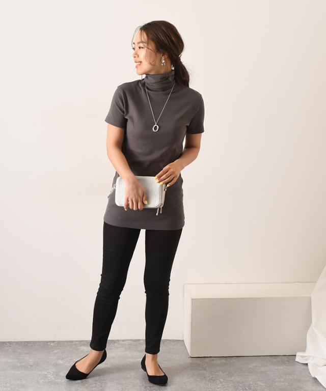 コンパクト ストレッチ タートルネック ロング丈 半袖 カットソー レディース トップス 綿 コットン インナー 春夏 きれいめ カジュアル 上品 オフィス 仕事 OL Tシャツ 伸縮 無地 シンプル 重ね着 レイヤード 20代 30代 40代 50代 通勤 通学 伸びる タイト スリム フィット 細身 華奢 おしゃれ ママ 大人 デイリー 洗える ウォッシャブル