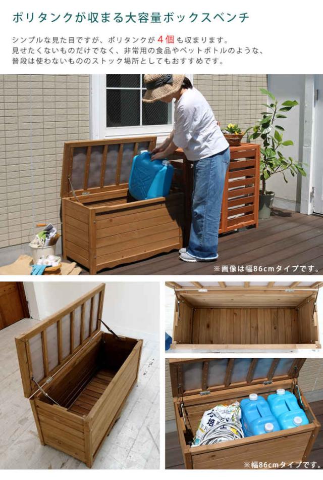■商品名:天然木製ボックスベンチ L 幅106cm ポリタンク4個+α収納OK 収納ボックス 収納ベンチ インテリア アウトドア 室内 屋外 ベランダ バルコニー 庭 ガーデン 家具 防災 備蓄 ストック おもちゃ箱