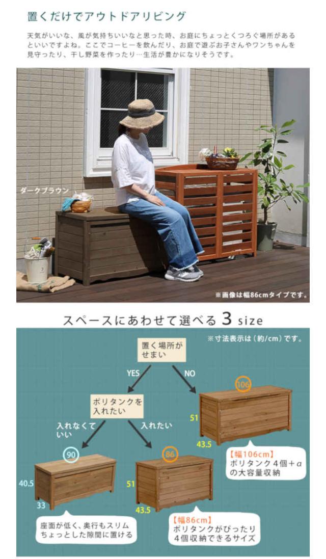 北海道・沖縄・離島配送不可 代引不可 天然木製ボックスベンチ L 幅106cm ポリタンク4個+α収納 収納ボックス 収納ベンチ インテリア アウトドア ベランダ バルコニー 庭 ガーデン 防災 備蓄 ストック おもちゃ箱 住まいスタイル BB-T106