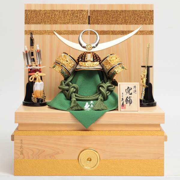 銘木シリーズの収納飾りです。収納箱にはナチュラルなカラーの檜を使用しました。人気の高い戦国武将・上杉謙信(うえすぎけんしん)タイプの兜です。端午の節句を象徴する鮮やかな緑色の袱紗(ふくさ)付き。