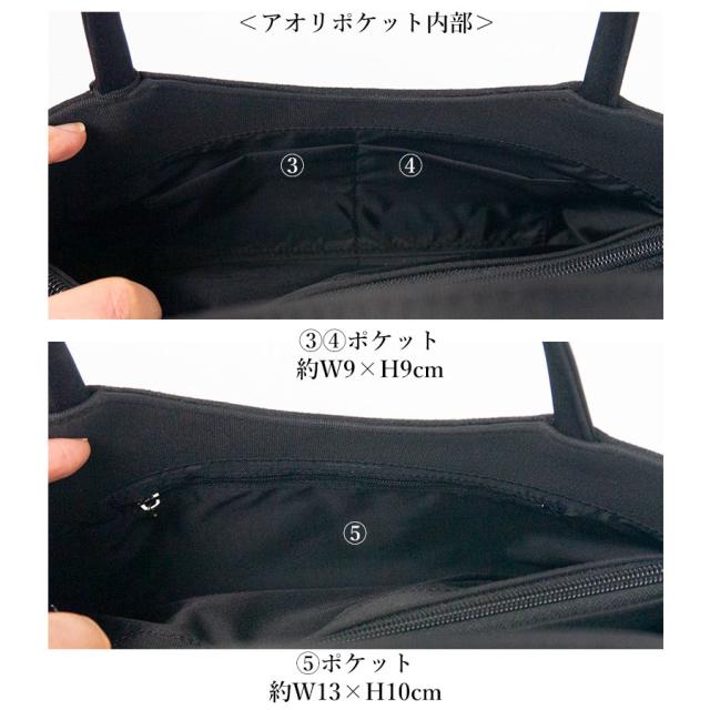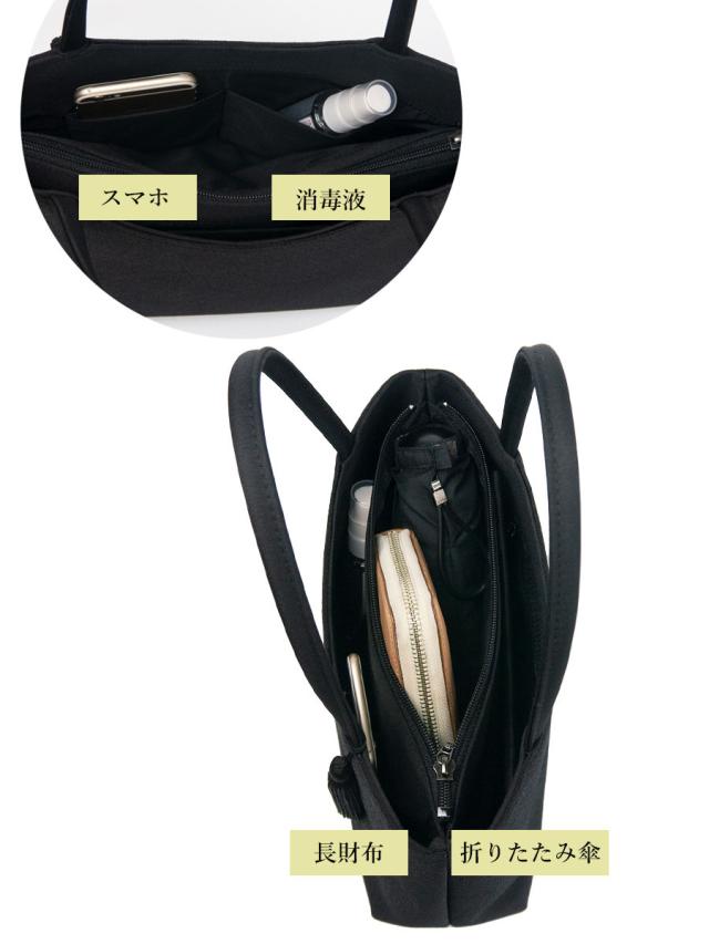 ■袱紗やお数珠などさっと取り出したいものを収納できるアオリポケットが機能的でシンプル上品なデザインです。メイン層には折りたたみ傘や長財布も収納可能のゆったりサイズです