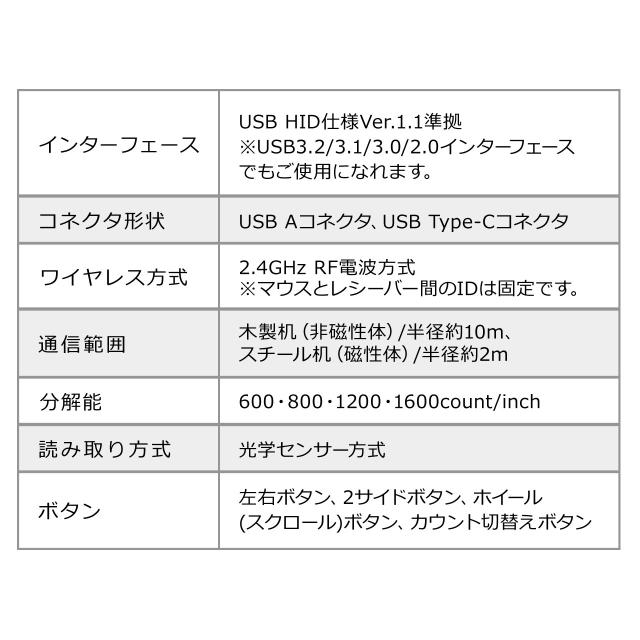 ■ワイヤレス方式:2.4GHz RF電波方式 ※マウスとレシーバー間のIDは固定です。