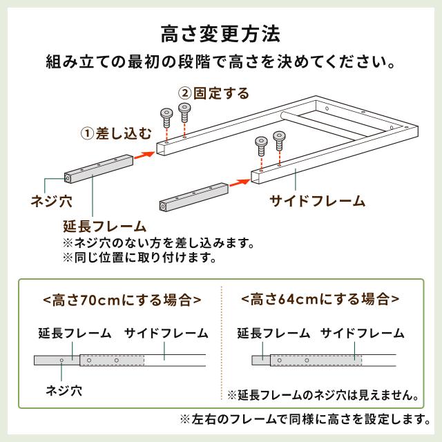 ●横幅90cm、奥行35cm、高さ70cmのキャスター付きデスクです。●高さは70cmか64cmかを選んで組み立てることが可能です。