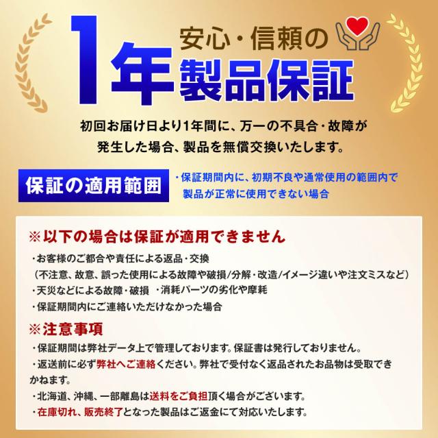 ※保証の範囲は商品のみの保証となります。それ以外、整備工場などで取り付けをした取付工賃などは保証の範囲外となります。