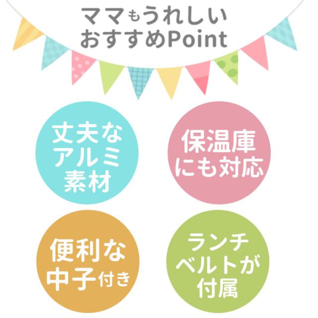 | 注意点 | [付属品]ランチベルト×1、名前シール×1 ※電子レンジ:不可 ※食洗機:不可 ※お取り扱いの際は、商品やパッケージなどに記載されている品質表示、アテンションタグ、ご使用上の注意事項などを必ずご確認下さい。 ※本来の目的以外にはご使用にならないで下さい。 ※カメラやモニターの性質により、画像と実物の色の違いがある場合がございますのでご理解願います。 |