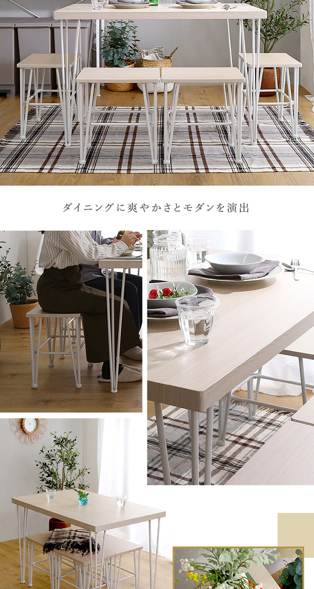 軽やかな朝に ダイニングテーブルセット 5点 【送料無料】 長方形 4人用 ホワイト 白 ナチュラル アイアン おしゃれ 背もたれ無し 椅子付き スツール