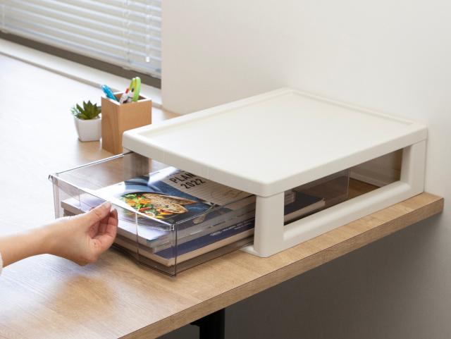 デスクの卓上収納としてだけでなく、棚上収納としても便利にお使いいただけます。本棚の一部に取り入れたり、ラックに並べて分別収納に使えば、棚上収納を充実させられます。