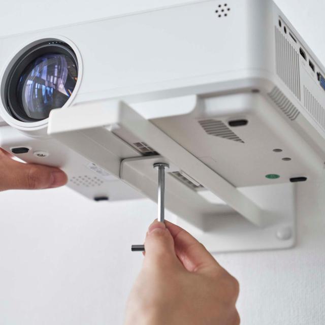 取り付けられるプロジェクターは底面に高さ約1cm以上の突起などの障害物がないこと、プロジェクター底面のネジ固定部が高さ約1cm未満・幅約1.2cm以内であることが条件です。また、背面に端子接続コードなどがある場合、約10cm以上隙間が必要です。(プロジェクター背面から底面のネジ固定部が約11.5cm以内)背面に端子接続コードなどがない場合、プロジェクターの背面から底面のネジ固定部が約2.5〜21.5cm以内に収まるものが取り付けられます。