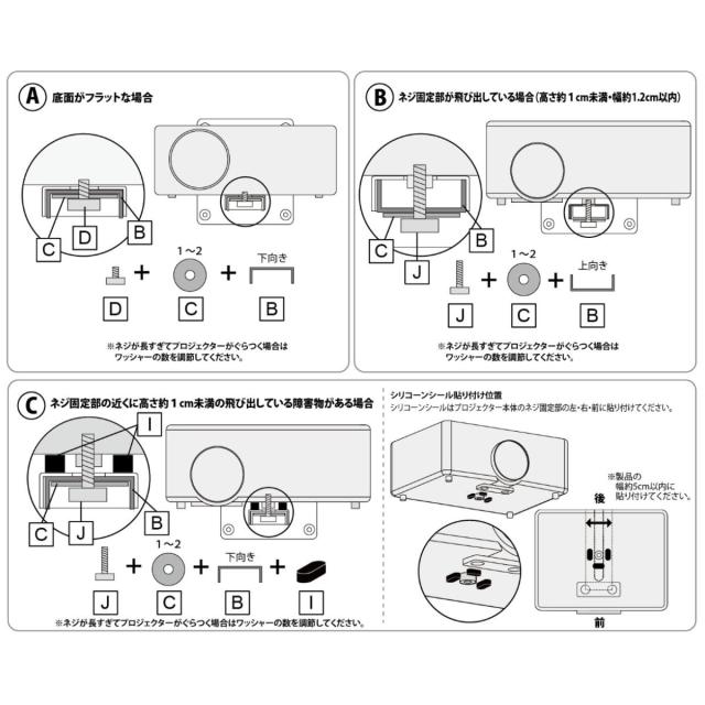 | 備考 | 対応サイズ:プロジェクター底面に高さ1cm以上の突起などの障害物がないこと。プロジェクター底面のネジ固定部が高さ約1cm未満、幅約1.2cm以内であること。 |