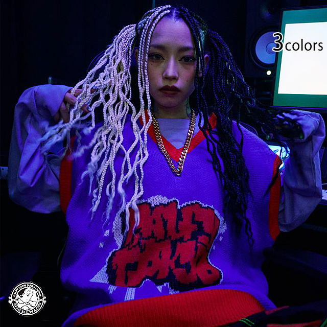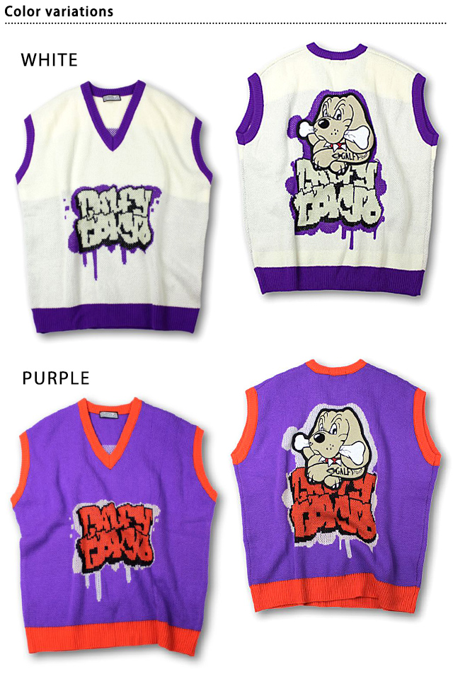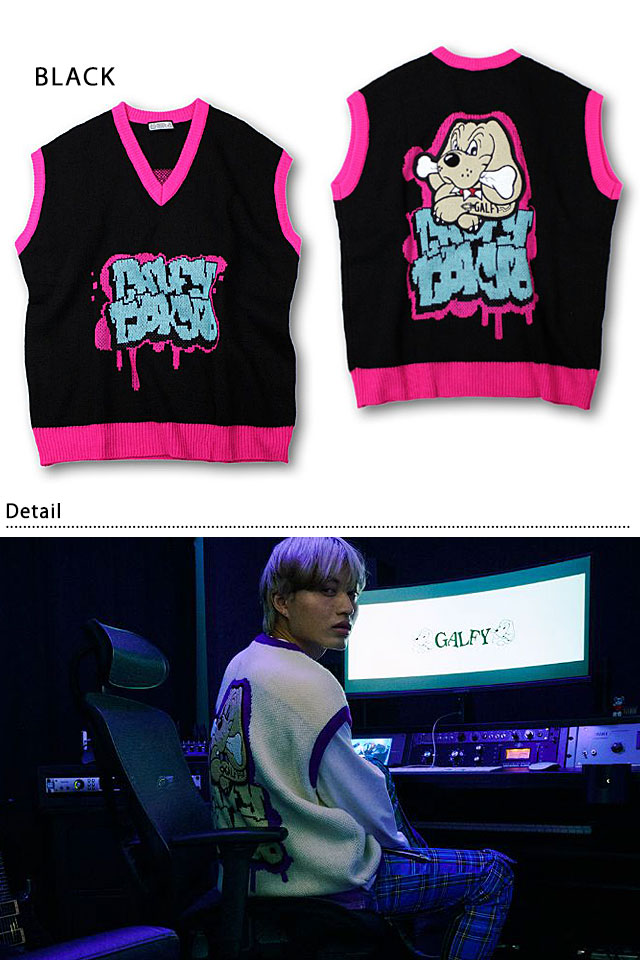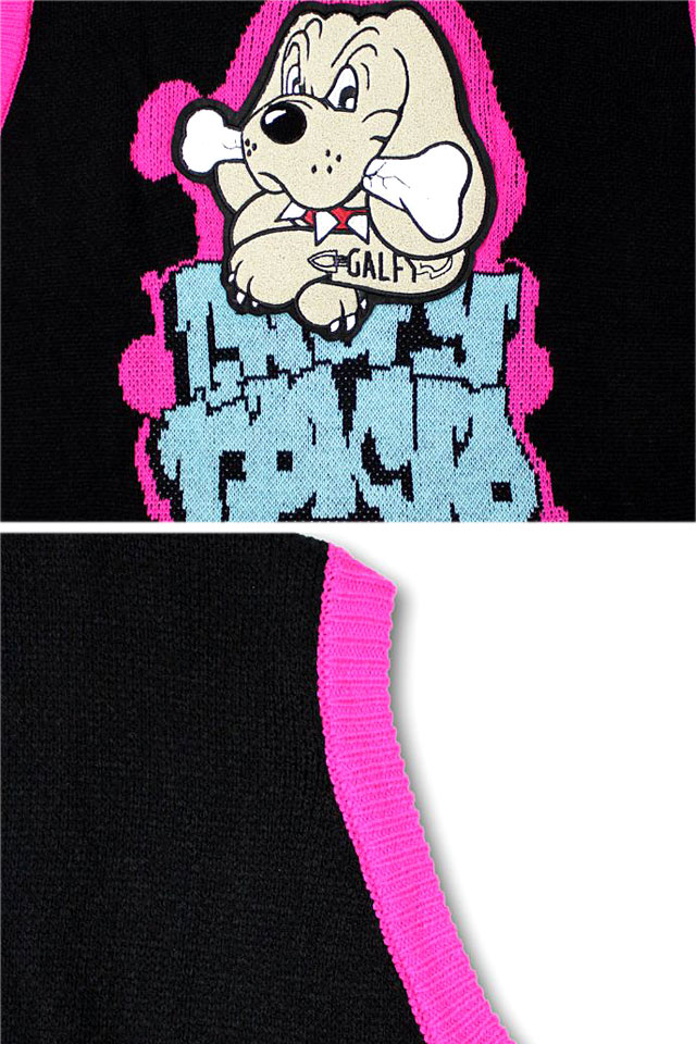 ストリートエッセンスを柔軟に捉え、都会的かつアクティブな提案を展開していく「GALFY」さんから「わんわん落書きニットチョッキ(131008)」のご紹介です。