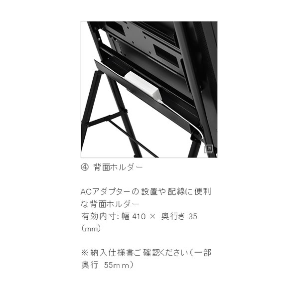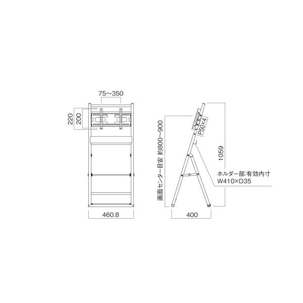 「イーゼル型の傾斜タイプ」 ■質量 約7kg ■総耐荷重 30kg (※取付モニター/ディスプレイ:15kg以下) ■外形寸法 幅 460.8 × 奥行き 400 × 高さ 1059 (mm) ■上下調節 50mmピッチ 3段階 ※記載は商品仕様の一部です。仕様説明不足等の理由での返品はできません。特に適合等は必ずご確認ください。