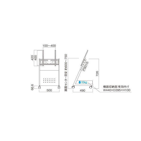 「フロントフラットデザイン、ローポジション設置」 ■質量 約10.5kg ■総耐荷重 60kg (※取付ディスプレイ:50kg以下) ■外形寸法 幅 500 × 奥行き 490 × 高さ 726 (mm) ■上下調節 50mmピッチ 4段階 ■機器収納部 耐荷重:10kg以下 有効内寸目安:幅 440 × 奥行き 395 × 高さ 100 (mm) ※記載は商品仕様の一部です。仕様説明不足等の理由での返品はできません。特に適合等は必ずご確認ください。