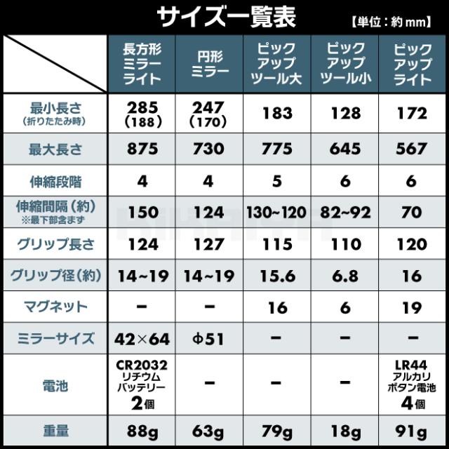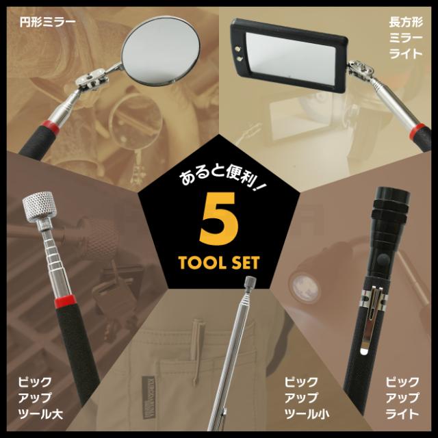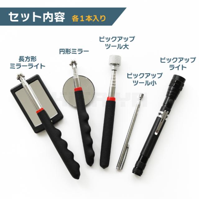 | セット内容 | ・ピックアップツール(大) ・ピックアップツール(小) ・ピックアップライト ・長方形ミラーライト ・丸形ミラー 各1個(計5個) |