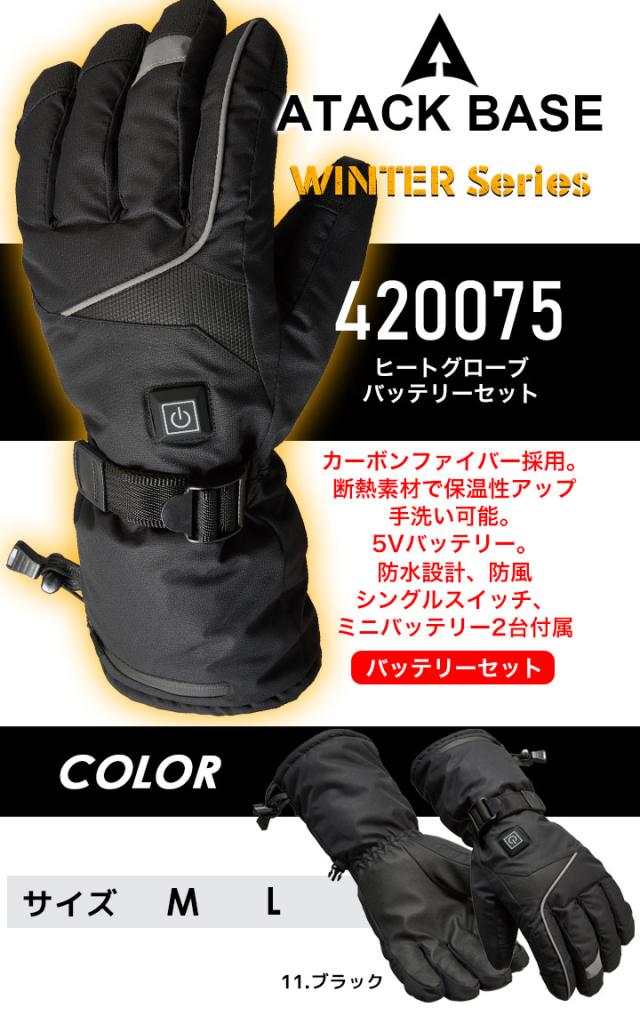 ヒートグローブ バッテリーセット アタックベース 420075 防寒手袋 アウトドア 釣り 暖かい 電熱グローブ 通勤 自転車 防寒グッズ 作業服 作業着