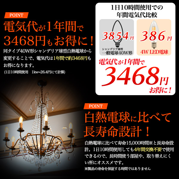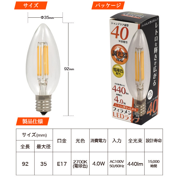 LEDランプ シャンデリア球型 レトロな輝き フィラメント型 電球 40W形 E17 クリア電球 4.0W LEDライト 調光器対応 LED電球 電球色 2700k 440lm エコ 省エネ インテリア照明 シャンデリア球 シャンデリアライト お店 店舗 節電 節税 店舗照明 電設資材 電気配線用品 新生活