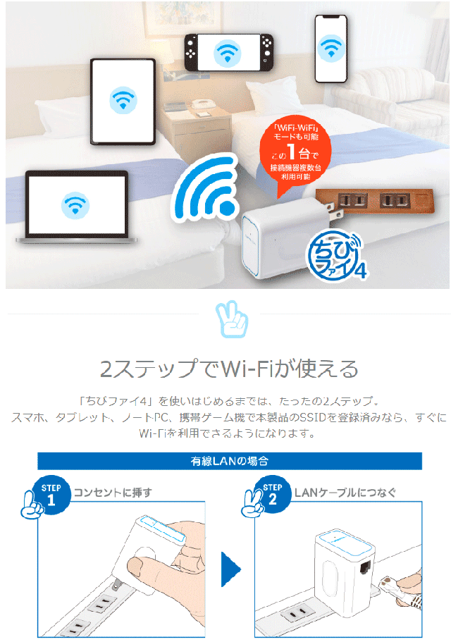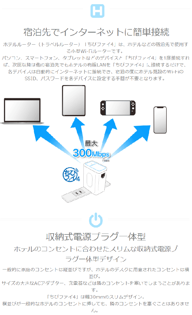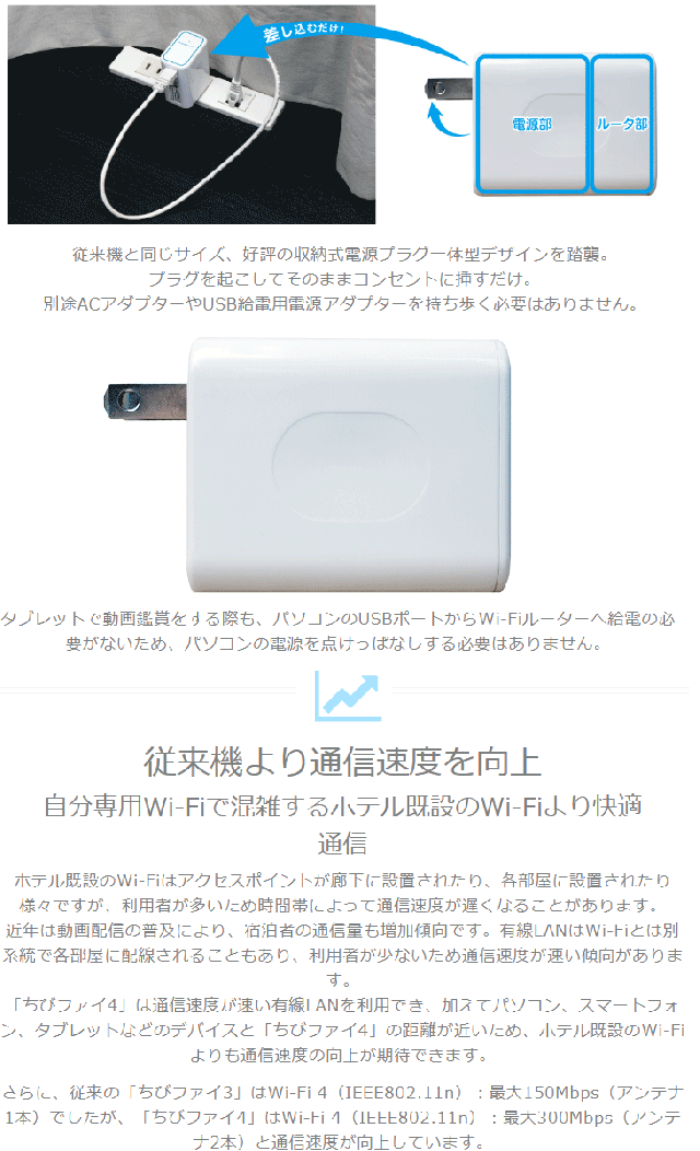 | ホテルでWiFi コンセント直挿型 無線LANルーター ホテル用 11n/g/b 300Mbps ちびファイ4 MZK-DP300N スペック情報 | |