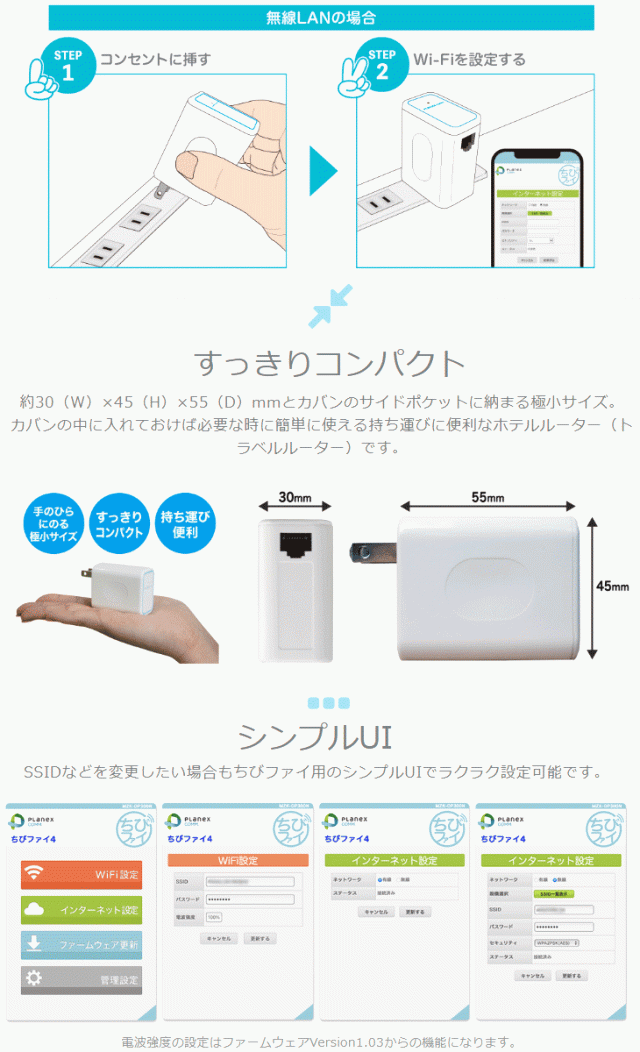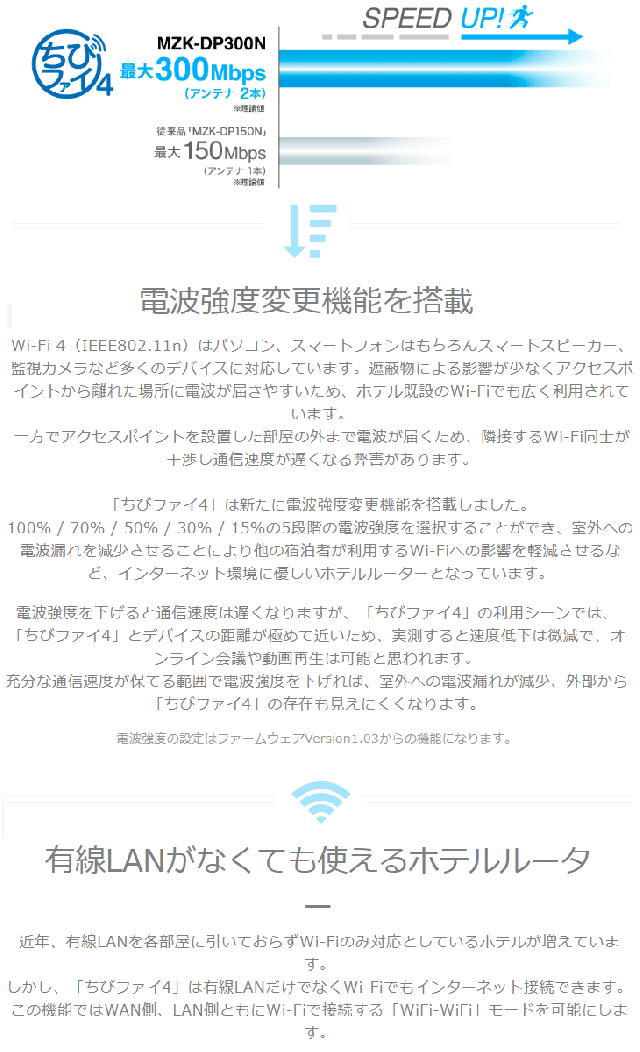従来の「ちびファイ3(MZK-DP150N)」のWi-Fi 4(IEEE802.11n):最大150Mbps(アンテナ1本)に対しWi-Fi 4(IEEE802.11n):最大300Mbps(アンテナ2本)と通信速度を向上、新たに搭載した電波強度変更機能(※)はWi-Fi出力を5段階に変更が可能で、室外への電波漏れを減少させることにより他の宿泊者への影響を軽減させるなど、インターネット環境に優しいホテルルーターとなっています。