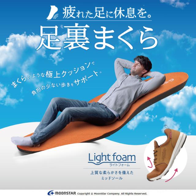 ムーンスターのメンズカジュアルスニーカーです。ミッドソールは柔らかくて衝撃吸収性に優れた「ライトフォーム」機能を搭載し、枕のような極厚ふかふかのウレタンクッションが足裏をしっかりとサポートします。ヒールの高さは4.0cmで、重量は26.0cmで片足約265gです。【ワイド設計】幅広の方に対応した商品です。【ヘルストゥラスト】日本人の足型に適したラスト(木型)を採用。ゆとりを持たせた爪先形状にすることで爪先への圧迫を軽減し、しっかりとした蹴り出しを実現します。【つま先ゆったり】つま先にゆとりをもたせた形状で、足の指を圧迫せずにのびのび動かせます。【衝撃吸収】歩行時の足・膝・腰にかかる負担を和らげるよう衝撃を吸収する素材を使用しています。【Ag+抗菌防臭】銀イオンの抗菌作用でにおいのもととなる菌の増殖を抑制し、防臭効果を発揮します。天然由来成分で安全です。