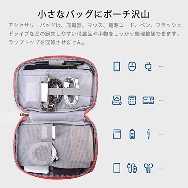 【アクセサリーポーチ付き】電源アダプタとマウス用に設計され、他の周辺機器も収納できます。外出の時にもっと便利になります。パソコンケースのジップと底部のボタンを開き、アクセサリーポーチは独立したのバッグとして使用できます。