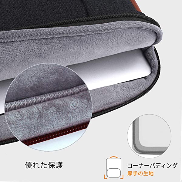 【保護力抜群】パソコンケース表面は撥水性に優れ、耐久性と高級感のあるナイロン生地を使用されました。長期間ご使用いただけます。愛機を保護します。パソコンバッグの内部全体が手触りの柔らかい天鵞絨で覆われています。表面と天鵞絨の間は厚いクッション材が入っております。不意な落下や衝撃を吸収し、ノートパソコンが傷つかないようにあらゆる方向から保護します。