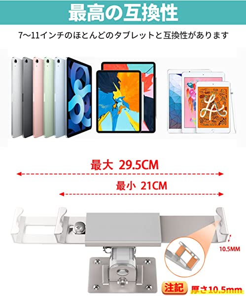 ユニバーサル壁掛けタブレットホルダー:盗難防止タブレットホルダーは、iPad Mini、iPad Air、iPad Pro、Galaxy Tab、LG G Pad 10.1、Sony Xperia Tablet Z4、Google Pixel Slateなどの7インチから11インチのタブレット(斜め)に適合します。 Surface Pro、Microsoft Surface、およびAndroid。また、最大厚さは10.5mm以下である必要があります。