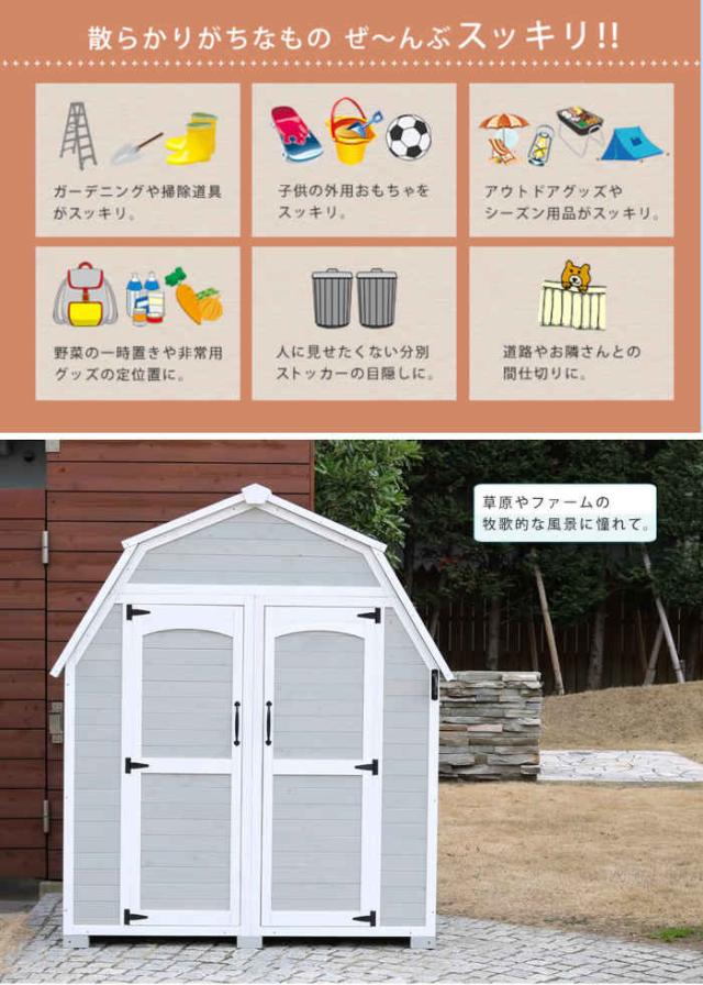 グレーホワイト ヨーロッパの田舎町のような、こころひかれる小屋。北欧や東欧の田舎町にタイムスリップ。まるでアンデルセン童話に出てくるような、おしゃれでかわいい大型収納庫です。個性的な二面切妻屋根は「ギャンブレル屋根」 といって、18世紀にヨーロッパからアメリカに伝承されたデザイン。グレー×ホワイトの配色がめずらしく、一般のご家庭でも、農園やファームの牧歌的な風景が叶います。このサイズ、かわいらしさ。家庭菜園の農具置きにぴったり。収納力抜群の大サイズ。ガーデングッズ以外にも、キャンプやバーベキュー用品、スケートボードやゴルフバッグの他、タイヤなどの車用品、三輪車やポリタンクのような生活感のあるものもスッキリ片づきます。お庭だけでなく、カフェやホテル、アトリエ、別荘、植物園などで、オブジェを兼ねた収納庫として置いていただけます。
