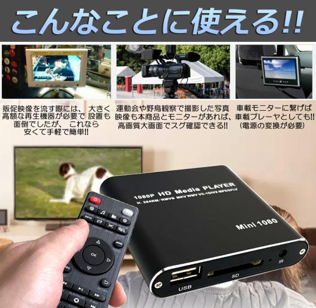 【簡単接続】 電源ケーブルとモニターケーブルを繋ぐだけの簡単設置!! あとは映像を記録させたUSBorSDorHDDを挿して、リモコンで再生させるだけ!! 操作メニューは日本語対応!!【多種ファイル形式に対応】 主要なAVI/FLV/MPEG-4/H.264のほか、合計12種類の映像ファイル形式に対応!! さらにMP3などの9種類の音楽ファイル形式、4種類の画像ファイル形式に対応!!