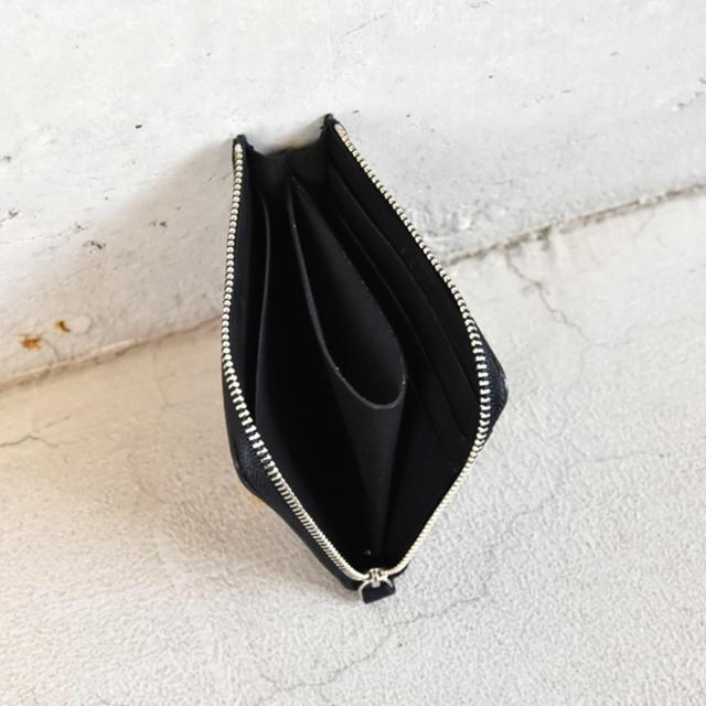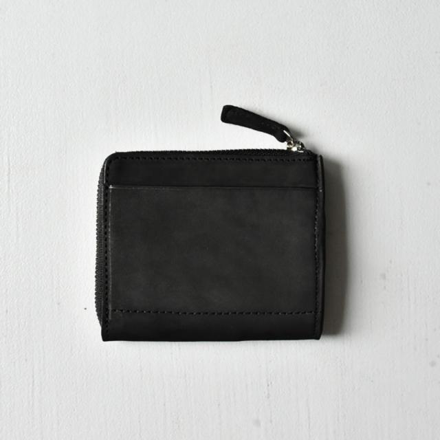 ヌバック素材を使った非常に柔らかなタッチ感の財布です。L字ファスナーで開閉が容易にできます。内装には小銭入れとして使用できる仕切りが付いており、仕切りの両側のスペースにお札やレシートなどを折って収納することができます。また、同じく内装には片側にカード棚が3つ、もう片側に1つ付いておりとても機能的です。外側にもカード棚が1つ付いています。