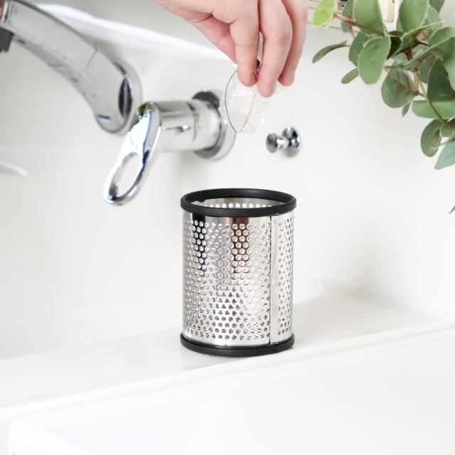 洗面スペースに置くのにぴったりな手のひらサイズの小さなゴミ箱です。直径約8cmととても小さなゴミ箱は、洗面スペースで出るコットンやティッシュなどの小さなゴミを捨てるのにぴったりです。小さめサイズなので、収納棚に閉まったり洗面台に置いても邪魔になりません。