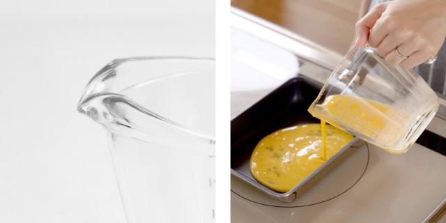 卵を溶いて、そのままフライパンに注いでも、液だれしにくくい構造です。作業台が汚れにくく、スムーズに作業ができます。