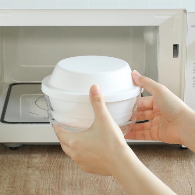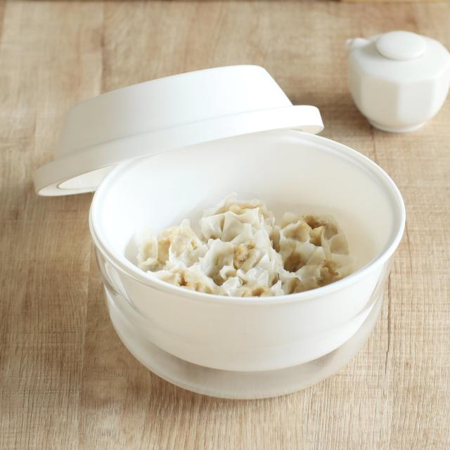 電子レンジで食材を蒸した後、ガラス容器はボウルとして使うことができます。シュウマイを並べて加熱するだけで、ふっくらジューシーに仕上がります。